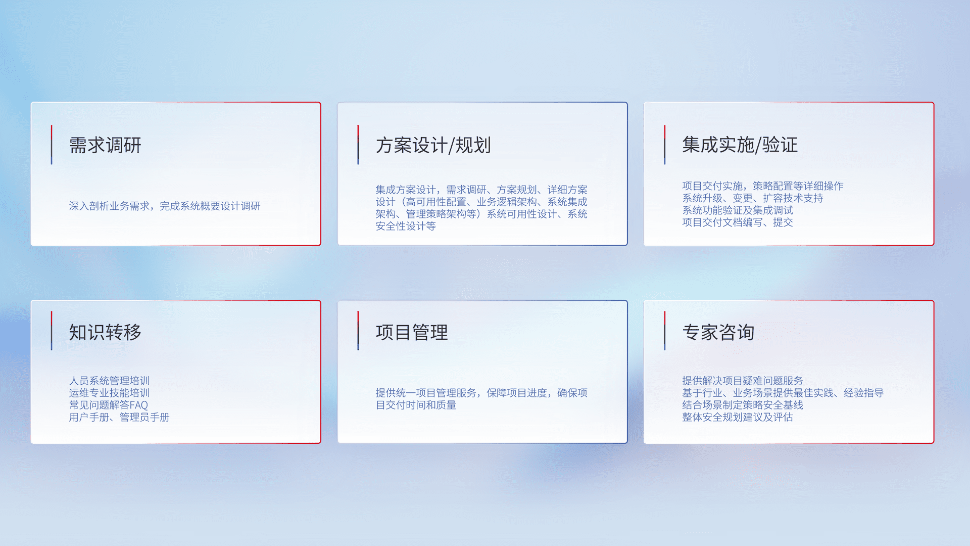 针对客户行业特性,,将宏观的安全战略和需求,,,通过专业的交付服务,,,,实现项目落地,,,,为客户提供标准规范的集成交付服务。。。。